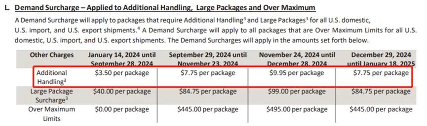 與此同時,大型包裹附加費也出現了顯著上漲,從40美元大幅上調至74.75美元,第二次上調則漲至99美元;超出最大限額包裹的附加費則先上調至445美元,之后再上漲至495美元。