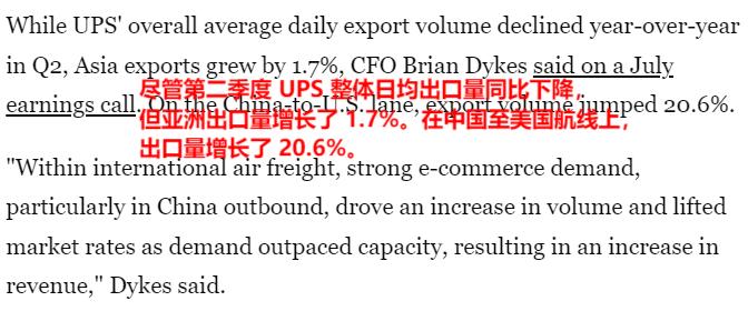 UPS首席財務官Brian Dykes曾在二季度財報會議上指出,雖然二季度UPS整體日均貨運量同比下降,但亞洲貨運量卻小幅增長了1.7%,尤其是從中國至美國的貨運量增幅最高,達到20.6%。