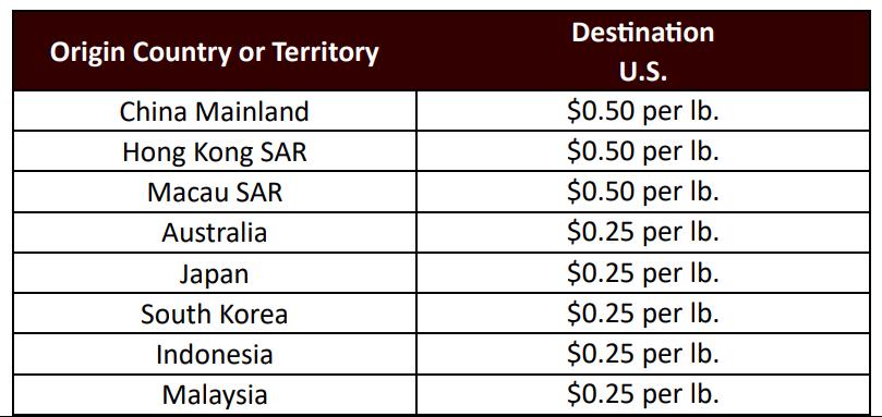 該費用將根據商品的重量計算,其中,中國大陸、香港、澳門三個地區的收費標準為每磅0.5美元,其他國家及地區的收費標準為每磅0.25美元。此外,托運人還需繳納燃油附加費。