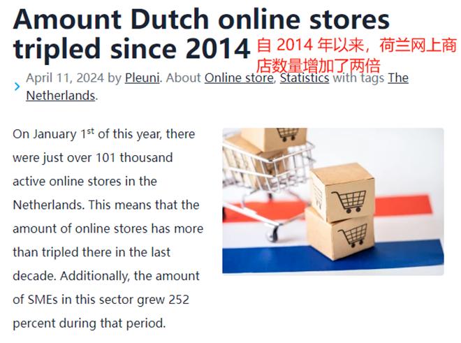 坦白來說,荷蘭電商市場是具有極大潛力的。據相關數據顯示,2023年荷蘭在線銷售額達到了347億歐元,消費者在線購買次數高達3.65億次。另外,截至2024年1月1日,荷蘭有超過10.1萬家活躍在線商店,相較于2014年增加了兩倍多。