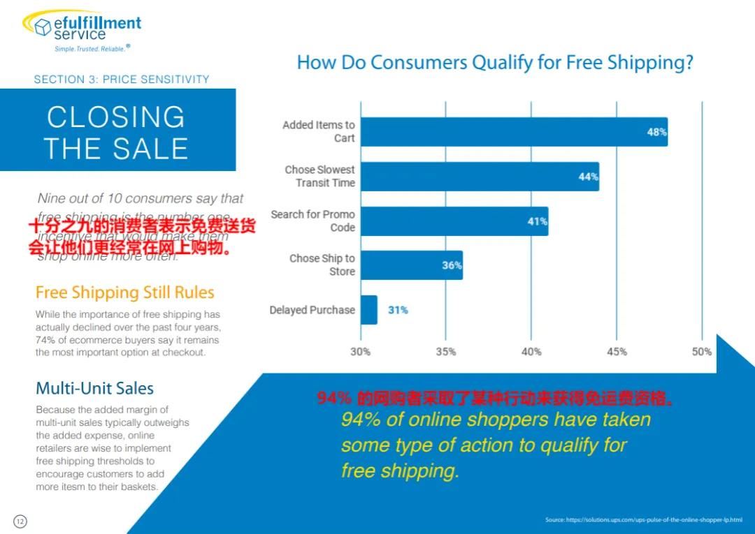據Efulfillment Service的一項調查結果顯示,有90%的消費者表示“免費送貨服務能夠提高他們的購物頻率”,甚至為了享受到免費送貨的服務,他們愿意采取增加購物車內商品數量、選擇最慢的運輸選項、搜索優惠碼等方式。
