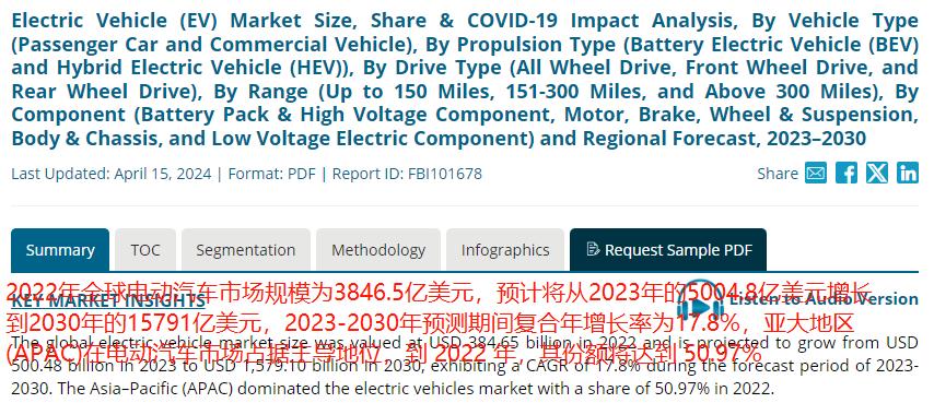 來自Fortune Business Insights發布的數據顯示,2023年,全球電動汽車的市場規模就已經高達5004.8億美元,未來幾年還會以17.8%的復合年增長率繼續增長,到2030年該市場規模將會突破萬億美元大關,為15791億美元。此外,全球電動摩托車、電動三輪車市場規模也爆發出了驚人的增長潛力。