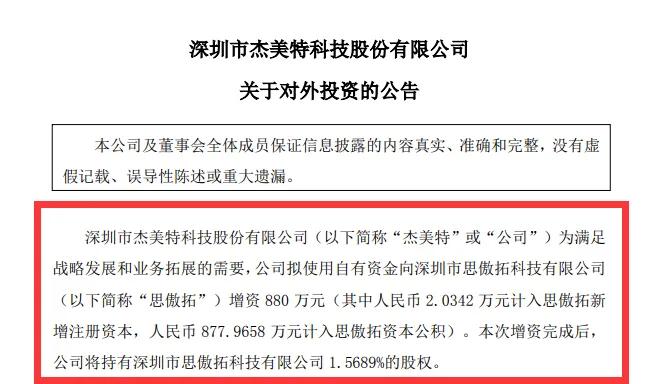 值得一提的是,杰美特雖發展現狀不如安克,但其也一直在努力中。為了拓展業務發展,杰美特此前發布公告稱,將使用自有資金向深圳市思傲拓科技有限公司增資880萬元,本次增資完成后,其將持有思傲拓1.5689%的股權。