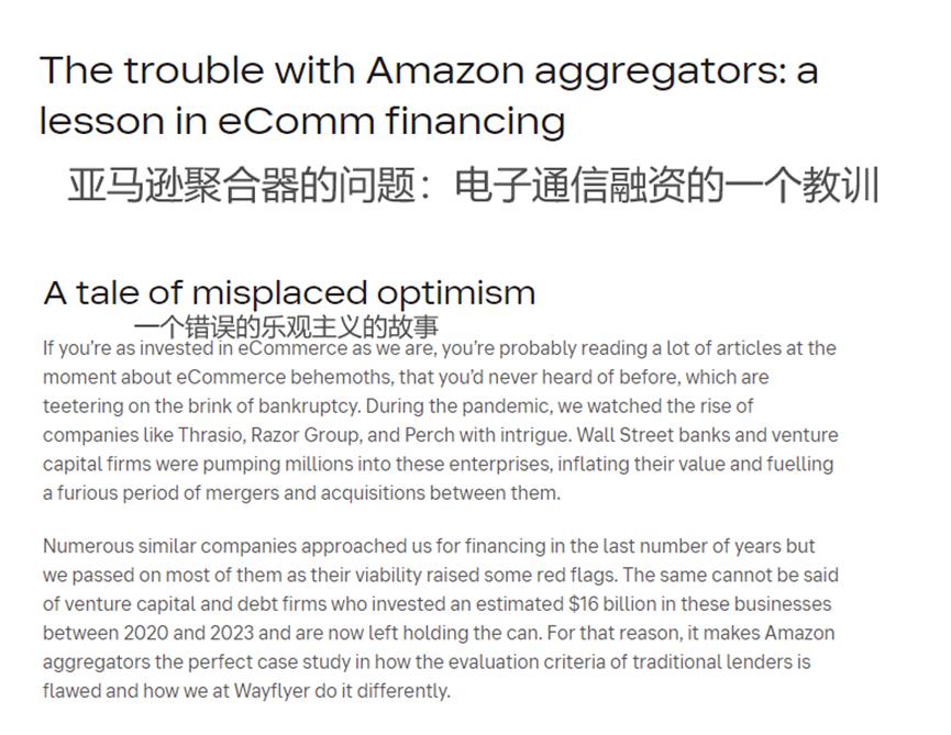 融資和營銷分析平臺Wayflyer在2023年發(fā)布《亞馬遜聚合器的問題:電子通信融資的一個(gè)教訓(xùn)》一文中就評價(jià)亞馬遜聚合商是“一個(gè)錯(cuò)誤的樂觀主義的故事”。