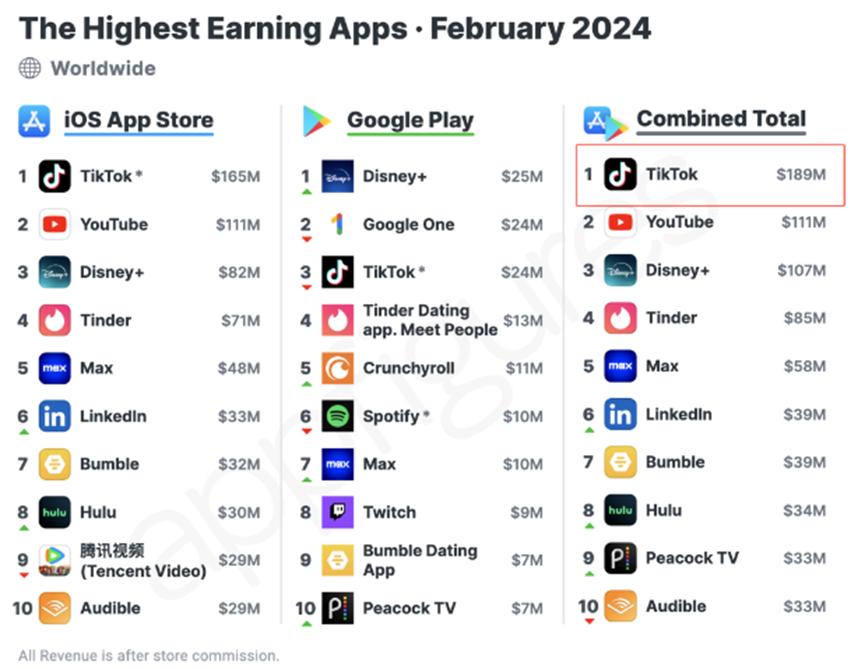 根據全球互聯網調研機構appfigures發布的2024年2月份全球應用程序收入(主要包括廣告收入和應用內購買)排行榜,今年2月份,TikTok以1.89億美元成為全球收入最高的應用程序,打敗YouTube、Disney等一眾競爭對手。而這一成績也在意料之中,畢竟這一榜單TikTok已經連續15個月霸榜第一。
