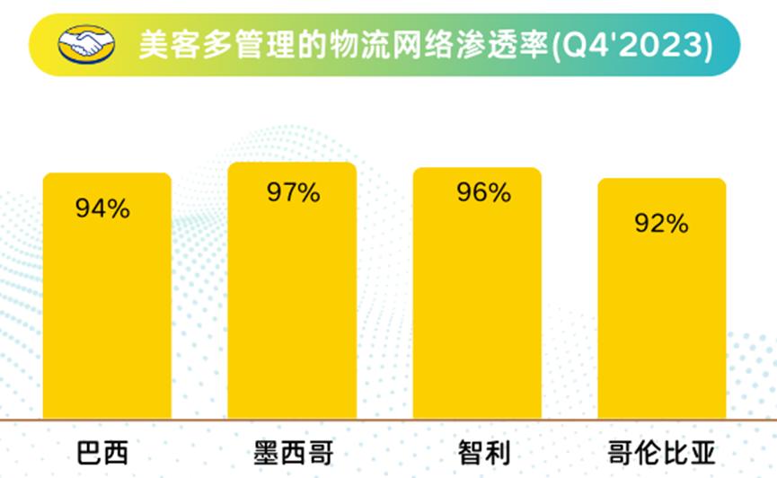 正所謂“寶劍鋒從磨礪出”,美客多前期在智利物流領域花費的種種心血最終也得到回報。該公司2023年年終財報就顯示,截至2023年第四季度,美客多的物流網絡滲透率達到了94.4%,其中智利市場物流網絡滲透率位列前茅,達到96%,僅次于墨西哥的97%。