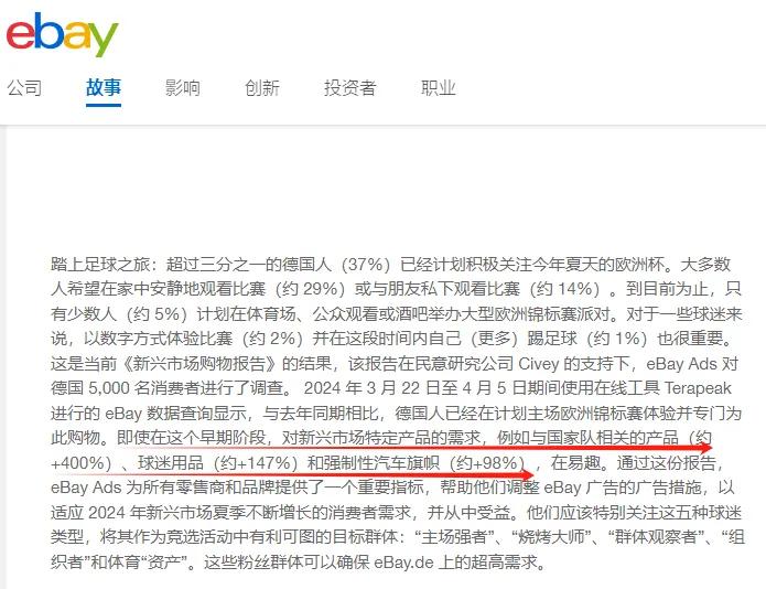 就以今年歐洲世界杯為例,從3月份開始,eBay德國站對歐洲杯相關產品需求激增,其中德國國家足球隊用品銷售額增長約400%,球迷商品和觀賽用品的銷量也分別增長了147%和98%,可見體育用品賽道蘊藏巨大商機。
