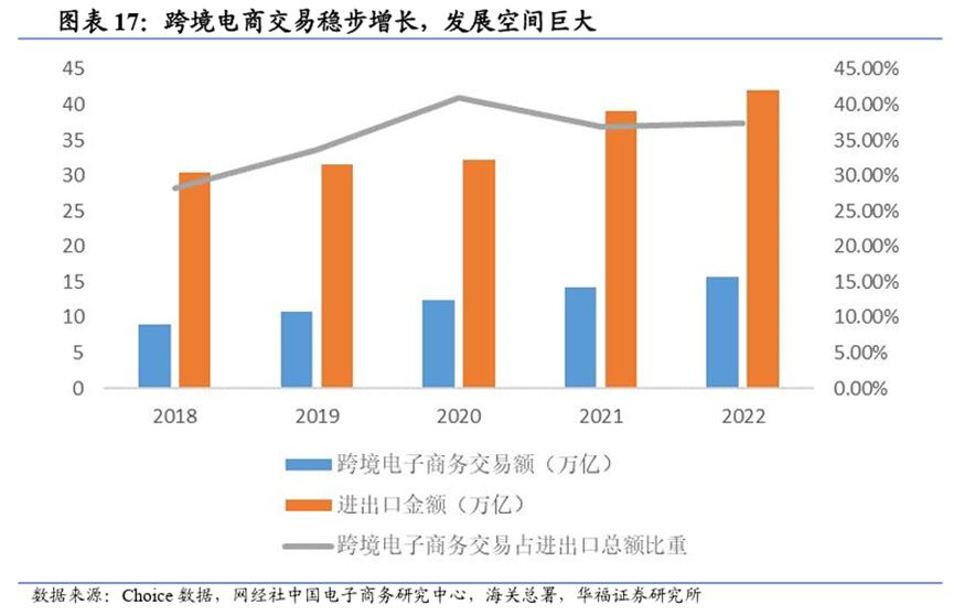 當然,必須要指出的一點是,焦點科技的成功,其實也是吃到了中國跨境產業迅猛發展的紅利。近些年來,伴隨著全球電商市場的增長,我國外貿也持續走高。2022年,我國跨境電商交易規模同比增長10.56%到15.7萬億元,在我國進出口總額中的占比將近40%(37.33%)。越來越多的企業出海,將產品和服務銷往全世界,自然也就連帶著焦點科技這種B2B服務商業績節節攀高。