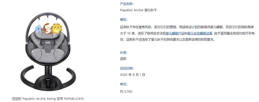 今年以來,CPSC也是緊急召回了不少存在安全問題的產品。8月初,Papablic Archie旗下一款售出了2700件的嬰兒秋千被CPSC緊急召回,原因是該款產品的傾斜角度較大,違反了嬰兒睡眠產品的相關規定,存在導致嬰兒窒息的風險。與此同時,這款秋千的遙控器中還含有紐扣電池,違反了其他一些安全規定和標簽要求。?
