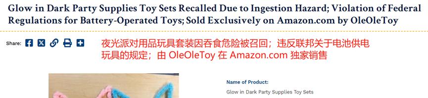 近日,據媒體報道,美國消費品安全委員會(CPSC)宣布召回OleOleToy旗下一款在亞馬遜平臺上銷售的派對玩具套裝,原因是存在安全隱患。