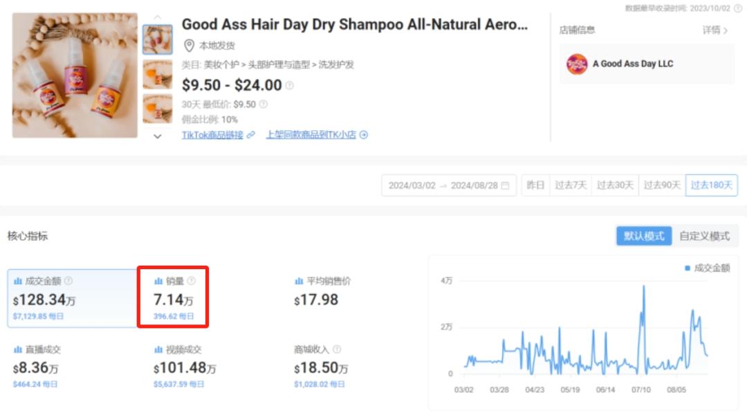 近期,一款干洗洗發水在TikTok Shop美區走紅,在過去半年中,該產品累計售出7.14萬單,目前累計總銷售額達300萬美元