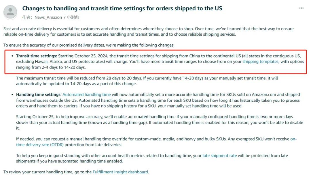 最近亞馬遜發(fā)布了一項(xiàng)新物流政策:從今年10月25日起,從中國運(yùn)往美國大陸(不含夏威夷、阿拉斯加及美國保護(hù)領(lǐng)地)的運(yùn)輸時(shí)間設(shè)置將發(fā)生變化。賣家在運(yùn)輸模板上的選擇范圍將從原來的2-28天縮短至2-20天,同時(shí)平臺將啟動自動處理時(shí)間機(jī)制,且賣家無法禁用此功能。