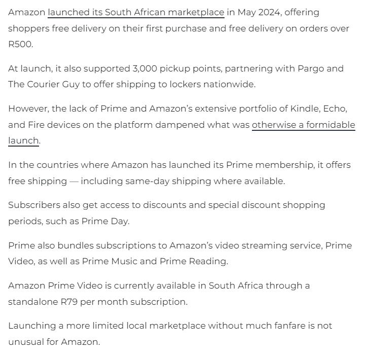 在推出時(shí),亞馬遜還支持3000個(gè)取貨點(diǎn),并與Pargo和The Courier Guy合作,為全國各地的儲(chǔ)物柜提供送貨服務(wù)。但Prime會(huì)員服務(wù)的缺失還是讓部分南非消費(fèi)者感到失望。