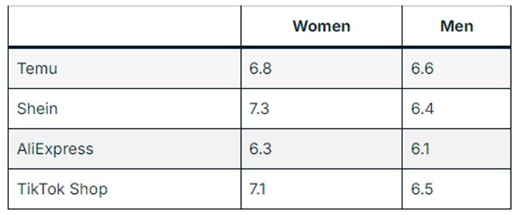 值得一提的是,英國消費者不論男女,都給這四家中國跨境電商平臺打出了6分以上的評分。不過相較于男性消費者,英國女性消費者更加熱衷于在這些平臺上進行購物,她們打出的評分也更高一些。