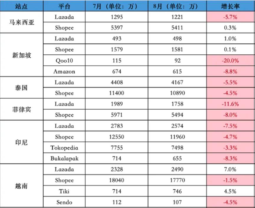8月份東南亞多個電商平臺流量下滑 圖源:跨境東南亞