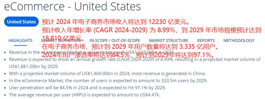一份來自Statista的數據也表明了美國電商市場的增長潛力:2024—2029期間,美國電商市場的規模預計將會以8.99%的復合年增長率持續擴大。到2029 年時,這一市場的規模可能會增長到1.88萬億美元。屆時,美國電商用戶數量將會達到3.335億,電商用戶滲透率也將從2024年的84.5%增長到97.1%。