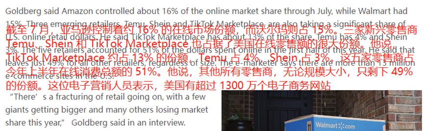 從市場占有率來看,亞馬遜在美國在線零售市場占據了16%的的份額,沃爾瑪占據了15%的份額。此外,中國三家跨境電商平臺Temu、SHEIN和TikTok Shop在美國在線零售市場所占的份額總共也達到了20%。僅上述這五家平臺,就占到了美國今年前7個月在線消費總額的51%,剩下的所有平臺所占份額僅為49%,而美國至少有1300萬家電商平臺。