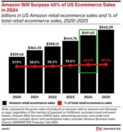 作為Temu起家的地方,美國市場同樣是亞馬遜的主戰場。去年,亞馬遜在美國的市場份額為39.6%,據權威市場研究機構eMarketer發布的最新預測數據顯示,2024年亞馬遜將占據美國零售電商銷售額的40.4%。
