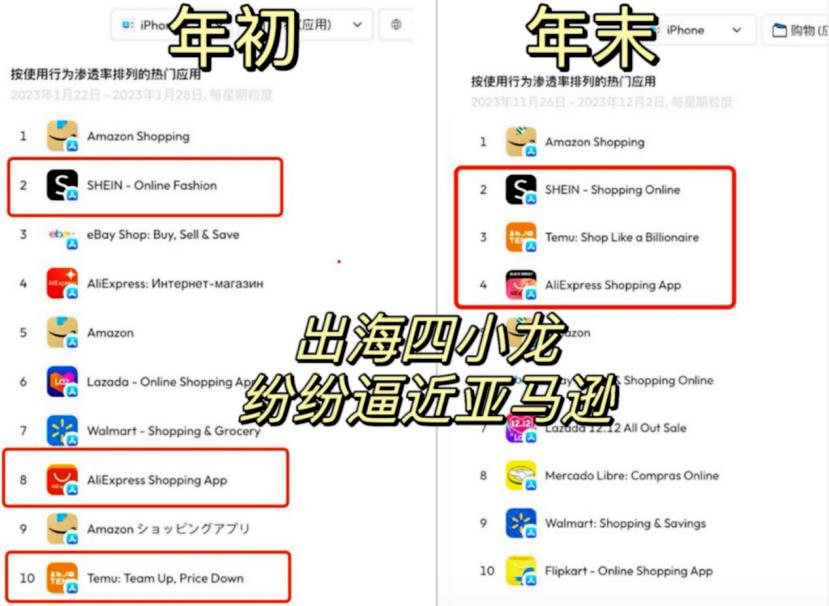 據data.ai發布的2023年iOS全球購物類App滲透率排行數據顯示,出海四小龍占據關鍵位置,對亞馬遜構成了直接威脅。