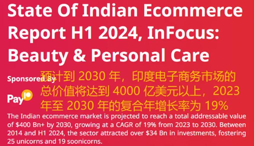 根據研究機構Inc42的發布的《2024年上半年印度電商市場報告》,當前印度電商市場規模約為1160億美元,而在2023年-2030年間,該市場將以19%的復合年增長率不斷擴大,并有望在2030年突破4000億美元大關。