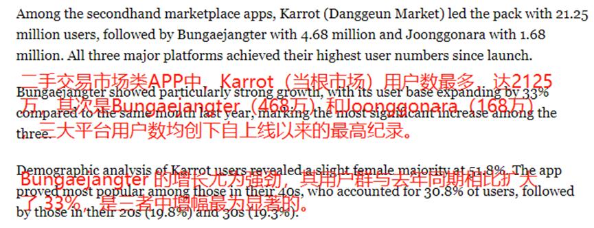 在這些二手交易應用程序中,用戶數量最多的是Karrot,它的用戶數量高達2125萬,遠遠高于排名第二的Bungaejangter(468萬)和排名第三的Joonggonara(168萬)。不過值得一提的是,Bungaejangter的增長速度在這三大巨頭中是最快的,它的用戶數量同比增長了33%,漲幅還是比較驚人的。
