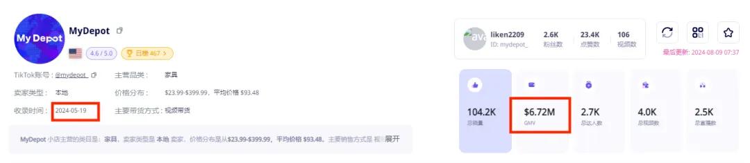 與恒健家居一樣在TikTok上爆賣的,還有國產家居供應商MyDepot。據Echotik數據顯示,MyDepot上線80天左右,其小店的銷量就超過了10萬,累計銷售額更是突破670萬美金。從時間上來看,MyDepot起步時間是較晚的,在5月下旬才上線TikTok Shop美國站,但表現卻是相當突出。