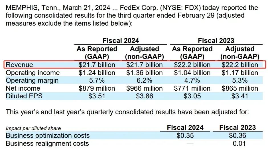 FedEx 2024財年第三季度營收 圖源:FedEx