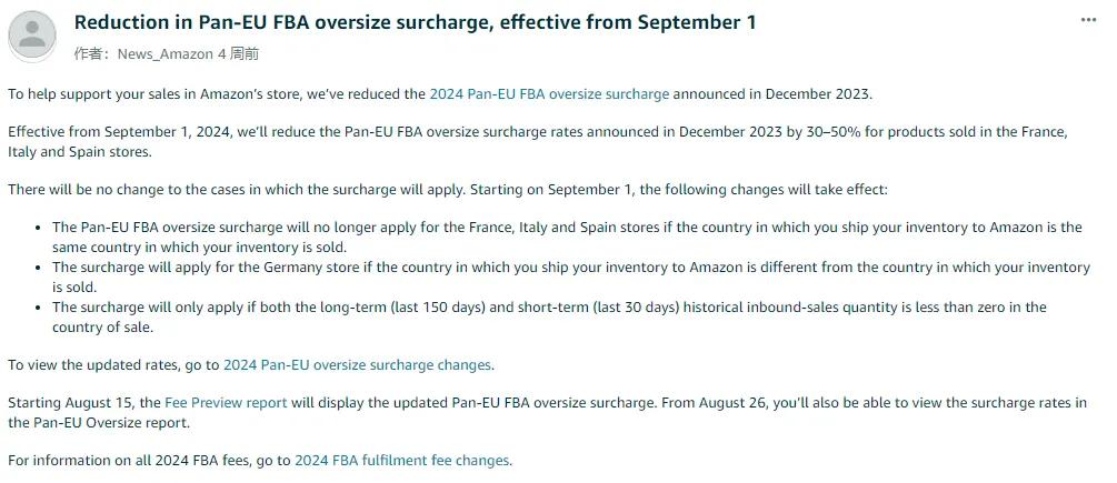 值得一提的是,就在上個月,亞馬遜還降低了去年12月宣布的物流歐洲整合服務計劃大件附加費。其在公告中寫道,“自2024年9月1日起,我們將對在法國、意大利和西班牙銷售的產品,泛歐盟FBA超大附加費率降低30-50%”,這一定程度上也減輕了賣家的成本壓力。