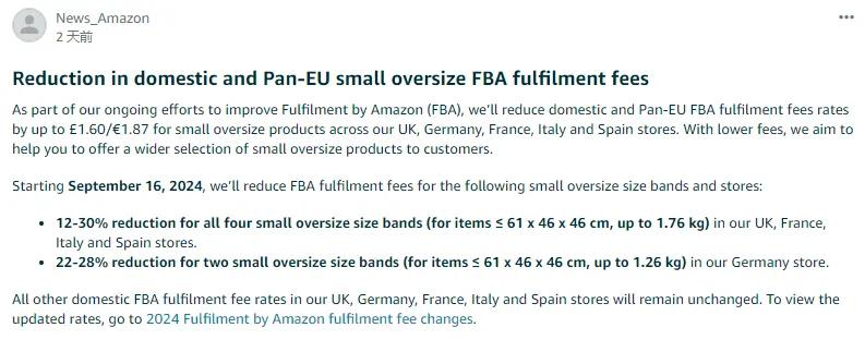 近日,亞馬遜歐洲站發布公告稱,為了改進FBA物流服務,自2024年9月16日起,平臺將降低英國、德國、法國、意大利和西班牙的國內和泛歐盟FBA配送費率。具體來講,針對小型超大件商品,費率最高可降低1.6英鎊或1.87歐元。