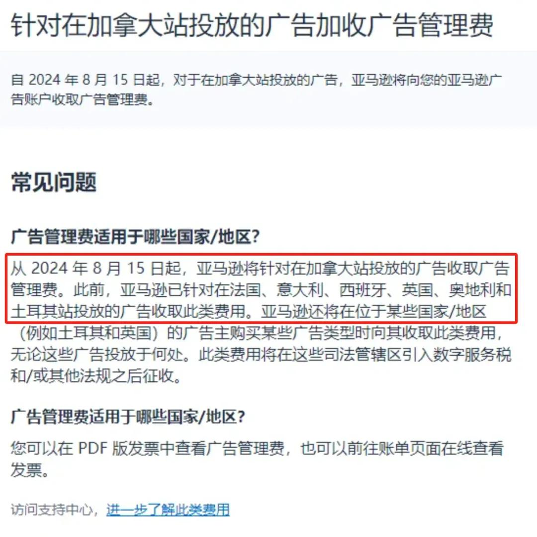 沒過多久,亞馬遜向賣家發送了一條郵件,郵件中顯示,自2024年8月15日起,任何在加拿大站投放的廣告都將被征收3%的廣告管理費。而在此之前,亞馬遜就針對法國、意大利、西班牙、英國、奧地利和土耳其投放的廣告收取這一費用。