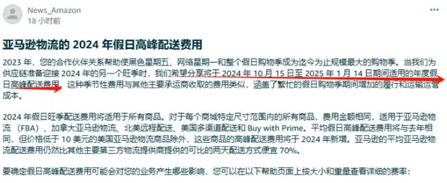 上個月底,亞馬遜宣布將在2024年10月15日至2025年1月14日期間實施特別的物流配送費政策,全面上調特定尺寸分段內的大部分商品以及服裝類商品的配送費,這其中普通包裹費用普遍上漲0.19美元至1美元、服裝類商品漲幅則在0.23美元至0.46美元之間。
