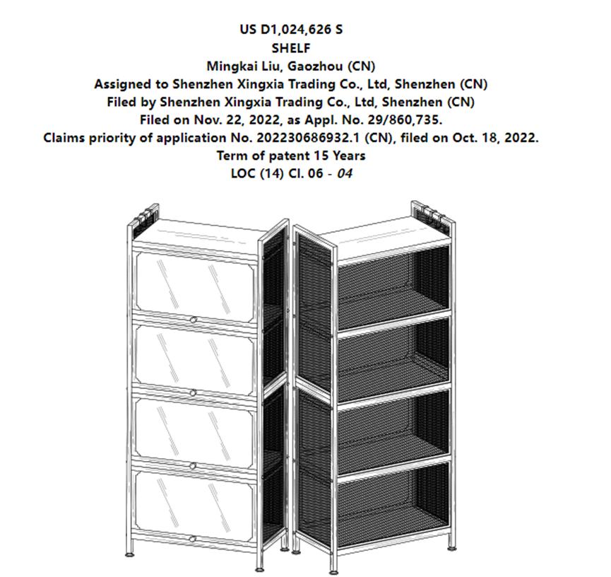 除了伸縮收納架之外,原告旗下的另一項專利也值得賣家保持警惕。據了解,今年4月份,該品牌在美國申請到一款貨架產品的外觀專利,專利號為USD1024626S。從外觀示意圖來看,該貨架產品也是市場上比較常見的款式,如果品牌方發起維權,估計又會有大批賣家要踩雷。