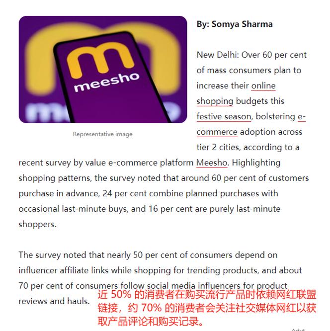 在《2024年電商假日季預(yù)測(cè)》報(bào)告中,Meesho就提醒賣家,如今網(wǎng)紅帶貨對(duì)印度消費(fèi)者影響很大,近50%的消費(fèi)者依賴網(wǎng)紅聯(lián)盟鏈接購(gòu)買熱門產(chǎn)品,約70%的消費(fèi)者通過(guò)網(wǎng)紅獲取產(chǎn)品評(píng)價(jià)和購(gòu)買建議。此外,正面評(píng)論也成為了消費(fèi)者網(wǎng)購(gòu)的主要驅(qū)動(dòng)力,近54%的消費(fèi)者將其視為重要考慮因素。