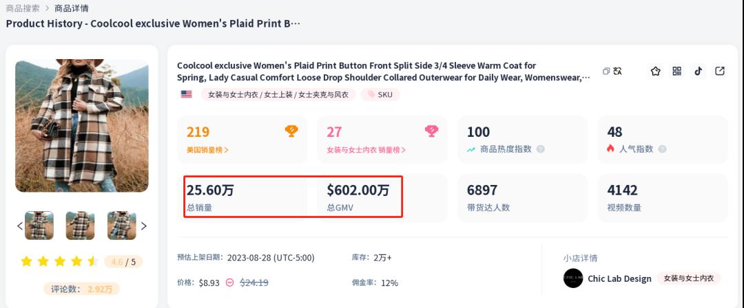 根據介紹,廣州遠峰創始人憑借著深厚的服裝設計經驗和商學院背景,組建了一支經驗豐富的跨境業務團隊,登上TikTok Shop跨境服裝的廣闊舞臺,一路開掛,強勢崛起。該公司推出的一款格子大衣,迅速成為了TikTok上的爆款。截至目前,這款格子大衣總銷量已達到25.48萬,上線一年,總GMV突破600萬美元。