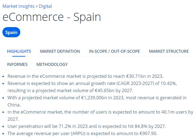 就以西班牙市場為例,據Statista的調查稱,2023年初西班牙的互聯網滲透率高達93%,網購用戶達到4512萬。預計在2023年至2027年期間,西班牙電商銷售額復合年增長率將達到10.42%,網購滲透率達到84.8%。