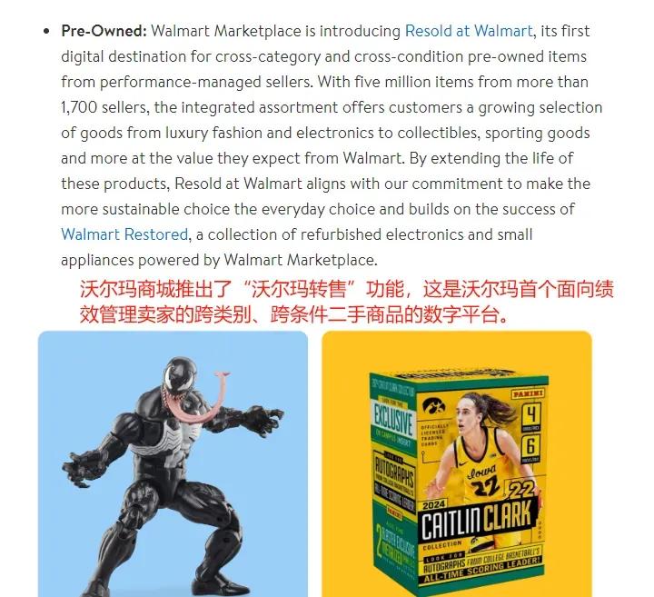 再比如不久前沃爾瑪正式推出了“沃爾瑪轉售”功能,平臺內將展示來自1700多個賣家的500萬件商品,從奢侈品時尚、電子產品到收藏品、體育用品等,這也是沃爾瑪首個面向績效管理賣家的跨類別、跨條件二手商品的數字平臺。