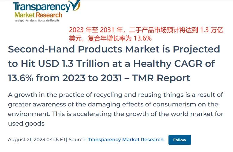 根據Transparency Market Research提供的數據,2023年至2031年期間,全球二手轉售市場的復合年增長率預計將為13.6%。到2031年時,市場規模有望增長到1.3萬億美元。其中歐洲到2025年將達到1200億歐元,與2021年相比漲幅高達60%。