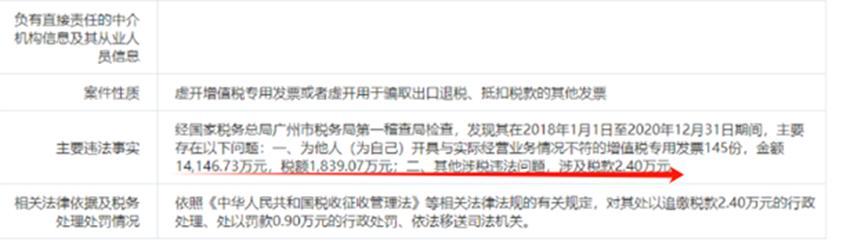 比如說,國家稅務總局廣州市稅務局第一稽查部此前發布的一則公告就指出,廣州世晨物流有限公司曾在2018年至2020年期間多次虛開發票騙取國家出口退稅或抵扣稅款,涉案金額高達1.4億元,稅額1839萬元。