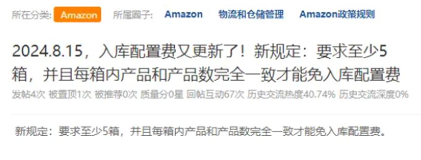 要知道,不久前亞馬遜才宣布更新入庫配置費(fèi),要求至少保證5箱相同數(shù)量和SKU的產(chǎn)品才可以分倉,每個(gè)紙箱內(nèi)的商品組合及其數(shù)量也必須保持一致,才能免去入庫配置費(fèi)。