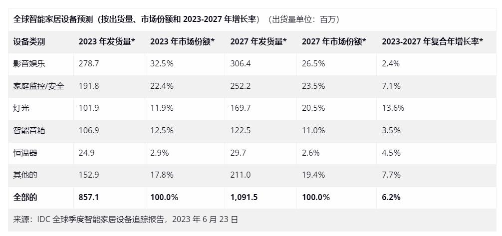 根據(jù)國際數(shù)據(jù)公司IDC的預(yù)測,盡管過去一段時間,智能家居市場在一定程度上受到了經(jīng)濟(jì)壓力上行的沖擊,但預(yù)計未來五年內(nèi),整個智能家居市場仍將實現(xiàn)大幅增長,尤其是智能安防設(shè)備、智能照明產(chǎn)品,復(fù)合年增長率預(yù)計將達(dá)到13.6%和7.1%。