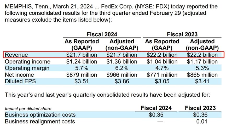 有數(shù)據(jù)顯示,截止到去年2月,FedEx的包裹量已經(jīng)連續(xù)三個季度出現(xiàn)下滑,降幅超過了10%。不僅如此,根據(jù)FedEx官方公布的財報,截止到今年2月29日的2024財年第三季度,FedEx的營收也出現(xiàn)了下滑,金額僅為217億美元,相較于去年同期的222億美元有小幅下跌,而且沒有達(dá)到今年市場預(yù)期的220.4億美元。