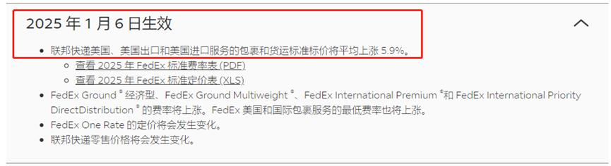 近日,據(jù)媒體報道,全球快遞巨頭FedEx(聯(lián)邦快遞)宣布,自2025年1月6日起,F(xiàn)edEx美國、美國出口和美國進(jìn)口服務(wù)的包裹和貨運(yùn)費(fèi)率都將平均上漲5.9%。據(jù)了解,F(xiàn)edEx每年都會上調(diào)費(fèi)率,2024年年初該巨頭同樣上漲了費(fèi)率,漲幅同樣是5.9%。