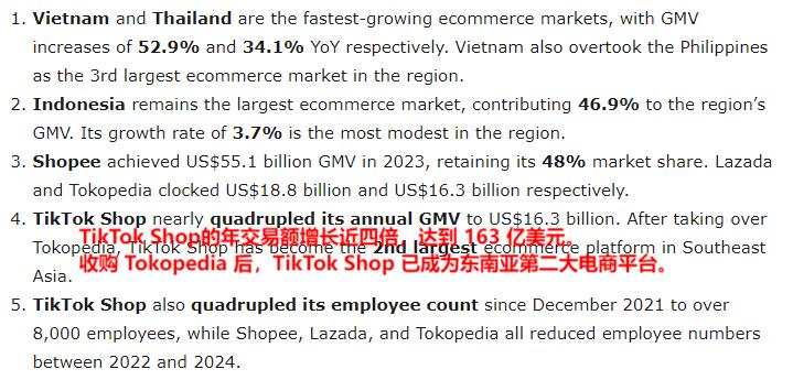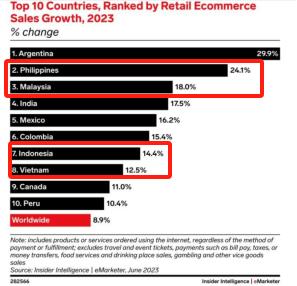據了解,截至2023年,東南亞已經連續三年成為全球電商規模增長最快的地區。此外,來自市場研究機構eMarketer發布的報告還顯示,在2023年全球電商規模增長最快的十個國家中,東南亞有四個國家上榜,增速都高于12%,遠超全球平均水平。