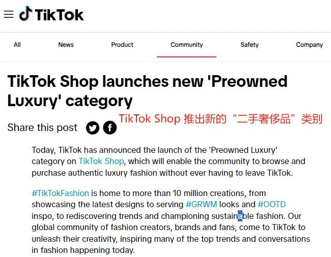 隨著這一趨勢的愈發(fā)顯著,也有電商平臺看準了這一風口并且做出舉措,例如TikTok。此前,TikTok就與知名的奢侈品鑒定機構(gòu)建立合作關(guān)系,打好基礎(chǔ);隨后,TikTok Shop又進一步擴大其二手業(yè)務(wù)的覆蓋范圍,將二手奢侈品類別引入英國市場。