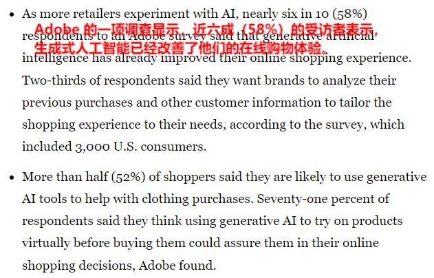 這是有據可依的。來自全球管理咨詢公司麥肯錫發布的報告曾經指出,在AI的推動下,未來幾年的電商行業將持續增長,有望帶來20%的額外收入。在Adobe的調查中,有58%的受訪者表示生成式AI大大改善了購物體驗,71%的人表示AI虛擬試穿功能提高了他們的網購信心。