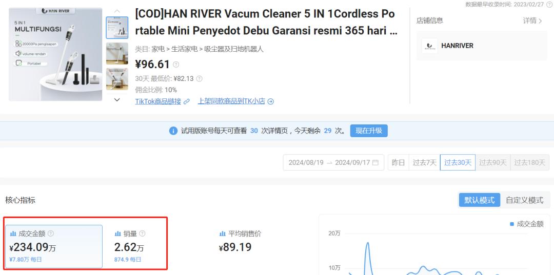 根據Kalodata統計的數據,HAN RIVER自動吸塵器位居TikTok印度尼西亞地區的排行榜第一,是名副其實的銷冠,近30天內賣出了2.62萬件,成交金額為33萬美金(約合人民幣234萬元)。