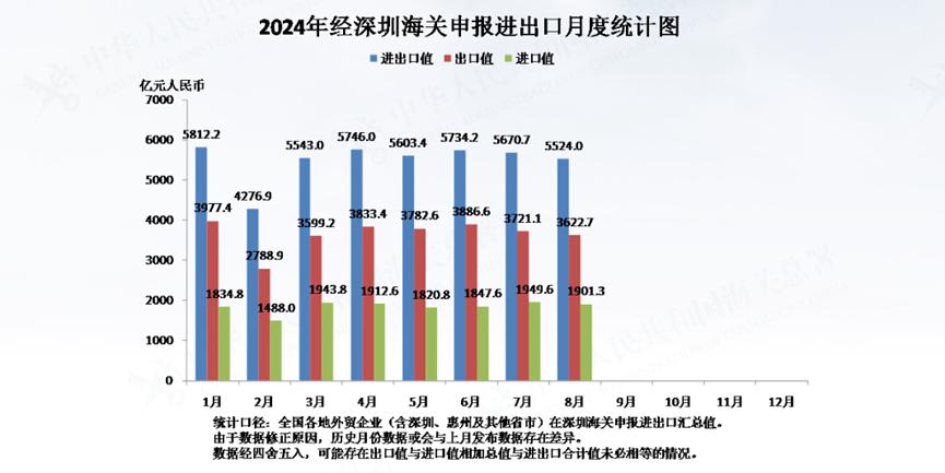 具體從各個月份來看,1月是進出口額最高的月份,金額達到了5812.2億元。2月的進出口總額有所下降,為4276.9億元。不過自2月之后,深圳進出口總額迅速回升,此后一直到8月,都穩定在了5500億元以上的水平。8月,深圳進出口總額為5524億元,其中出口額為3622.7億元,進口額為1901.3億元。