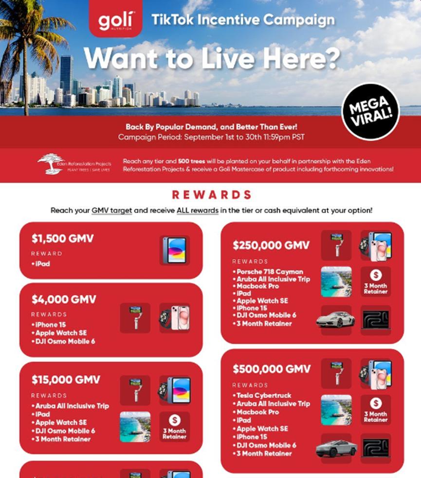 值得一提的是,Goil Nutrition還承諾,只要達人當月的GMV達到120萬美金,就可以免費獲得一套位于邁阿密的公寓豪宅、一部手機、一套筆記本電腦、3個月保留以及一輛摩托艇。如果達人對以上獎勵不滿意,也可以選擇直接拿走52.5萬美金(約合人民幣超350萬元)。