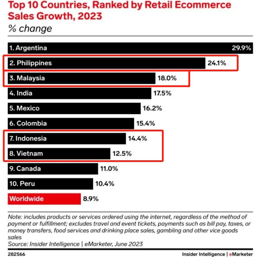 先來看看東南亞電商市場,相比與歐美發達市場,東南亞有著更大的增長潛力:據此前eMarketer發布的一份報告數據顯示,在電商增長最快的10大市場中,東南亞占據了榜單的一半,東南亞的增速也遠超全球電商平均增速的8.9%。