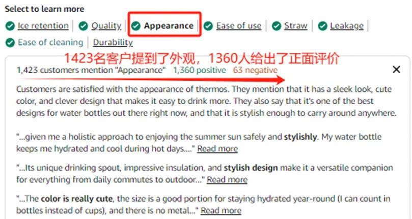 實際上,憑借“顏值”出圈的產品也早就有成功的案例擺在面前了。此前Owala主打的freesip系列產品,就憑借“高顏值”在海外出圈了。從亞馬遜平臺上有關feesip杯子的評價中,在1400多條提到外觀的評論中,有1360條都是好評。